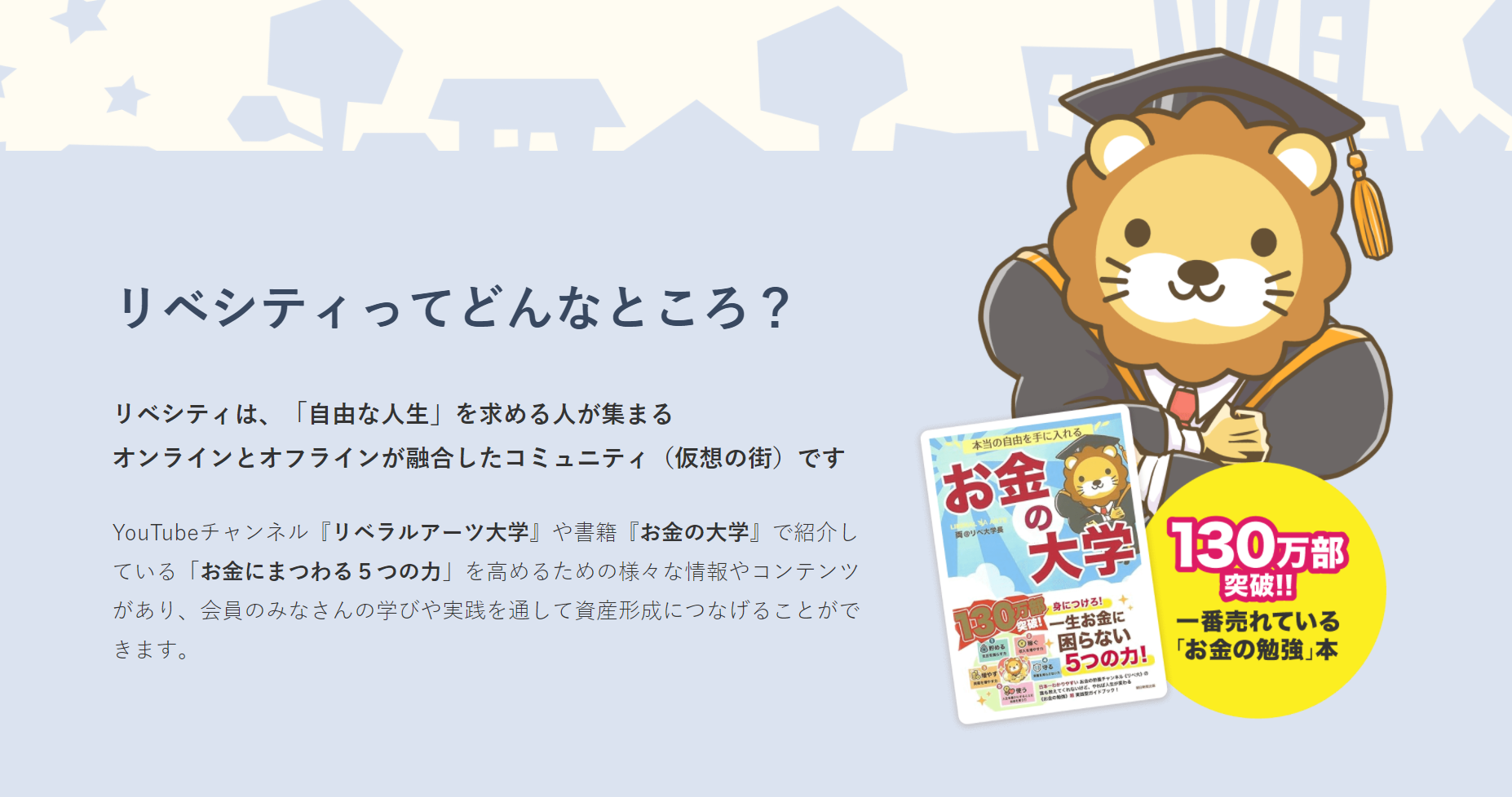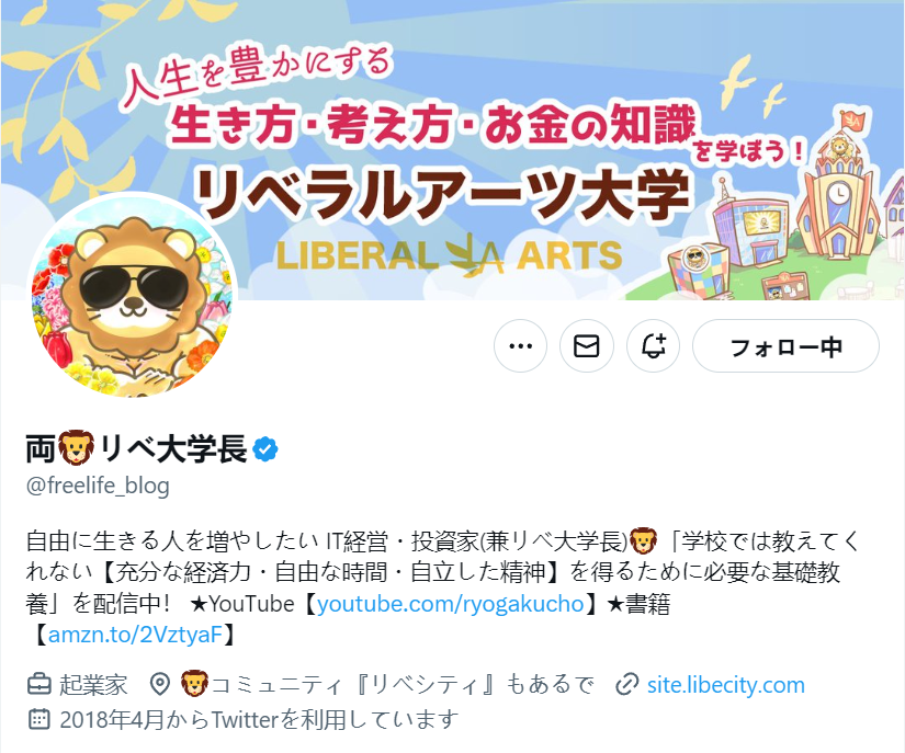 「日本一自由な会社」の社長。高校在学中に起業し、ITビジネスと投資で10代にして年間1億円以上を稼いだが、数々の失敗も経験し、優秀な経営者仲間やモルディブの大富豪から「本当の社会の仕組み」や「人生を豊かに生きる知恵」を学ぶ。以降本業で20年以上稼ぎ続けながら、「自由な人を増やす」という夢を叶えるために家族や友人向けに発信を始めた通称「リベ大」は、節約・税金・投資・副業のリアルガチなお金の教養を軽妙な関西弁でわかりやすく解説する内容でSNSを中心に熱狂的な支持を得る。YouTube総動画本数1500本超、累計再生数5.5億回超、チャンネル登録者数228万人。Twitterフォロワー数47万人。公式ブログ月間330万PV。Instagramフォロワー数41万人。本書が初の著書となる。Twitter:@freelife_blog